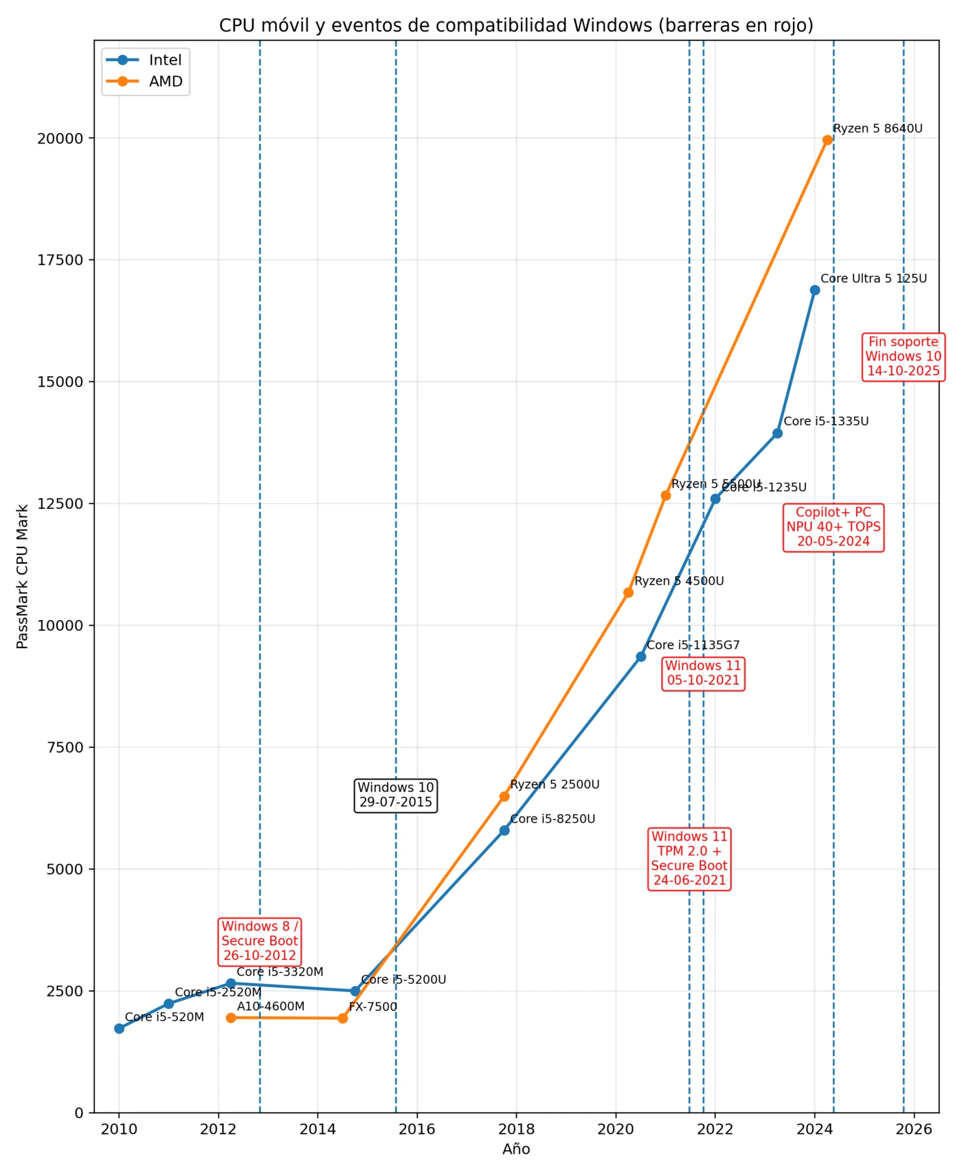 Fuente: elaboración propia a partir de PassMark CPU Benchmark, documentación oficial de Microsoft sobre Secure Boot, requisitos de Windows 11 y Copilot+ PC, fin de soporte de Windows 10 y la síntesis de rumores publicada por PCWorld.
